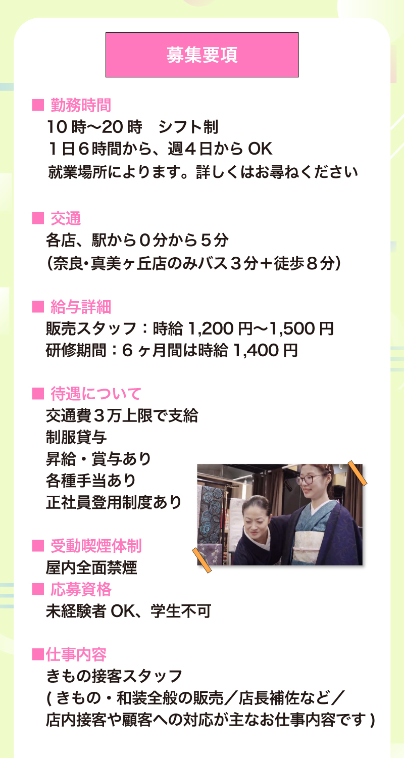 A.制服貸与の制度があるので、通常時は動きやすい制服で働いていただきます。イベントの時は着物を着ることもありますが、入社前は着付けができない方が大半です。