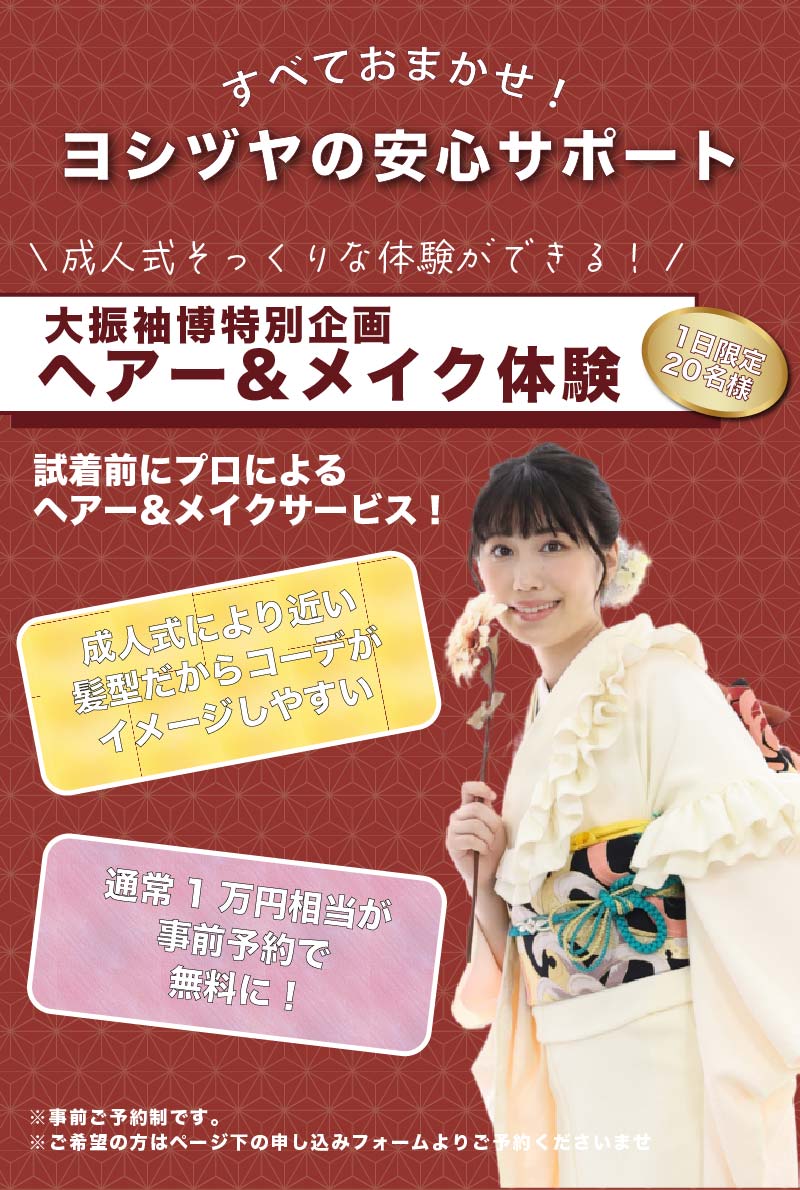 振袖のご予約は成人式の3か月前まで(レンタルなら1か月前まで)であれば可能でございます。成人式当日の着付け時間や振袖の柄はご成約順に埋まっていってしまうため、できるだけ早めにご予約いただくことをおすすめします。