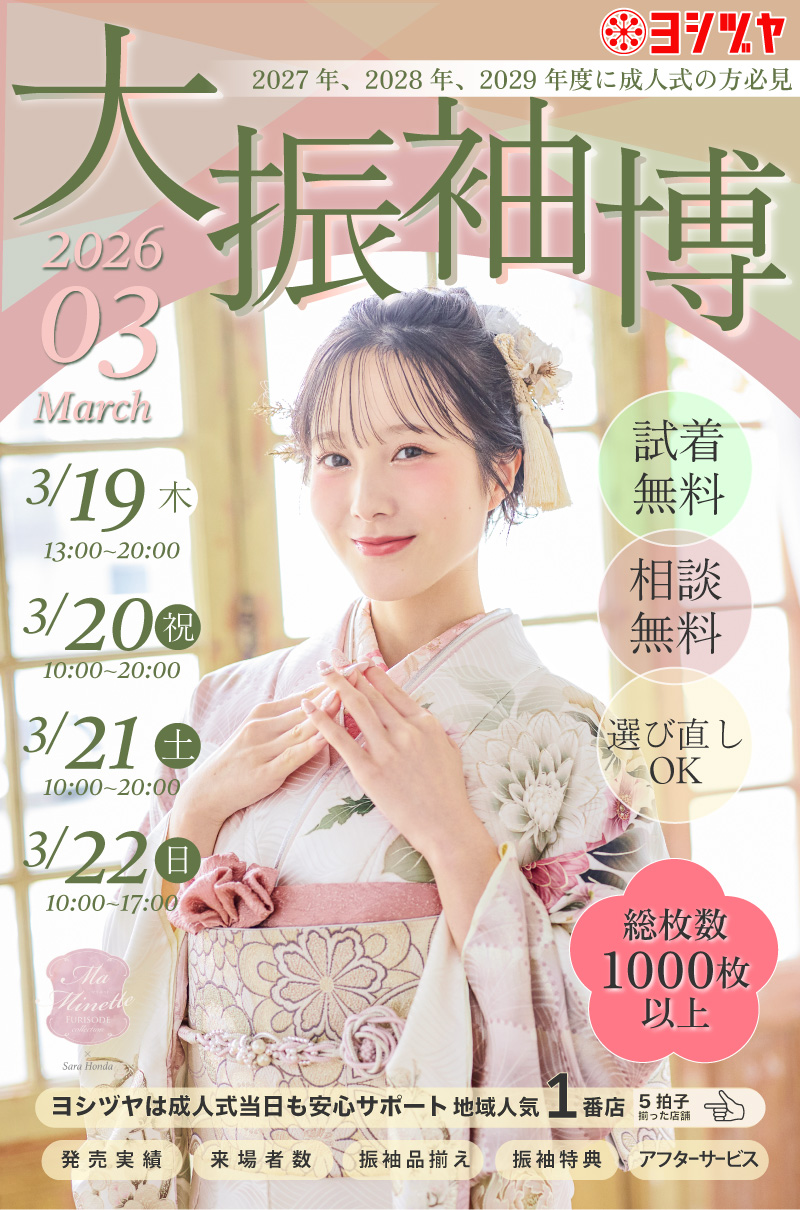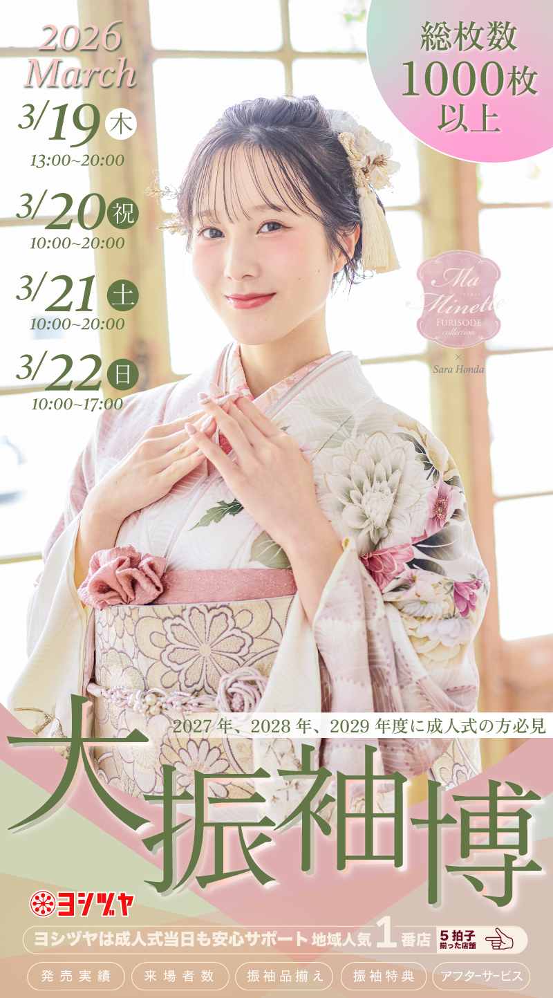 振袖のご予約は成人式の3か月前まで(レンタルなら1か月前まで)であれば可能でございます。成人式当日の着付け時間や振袖の柄はご成約順に埋まっていってしまうため、できるだけ早めにご予約いただくことをおすすめします。