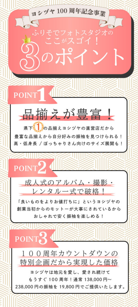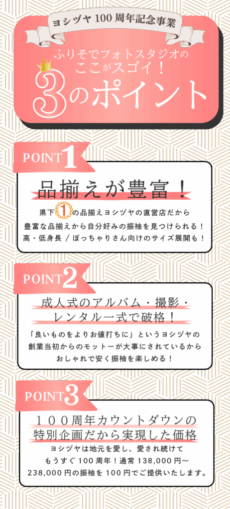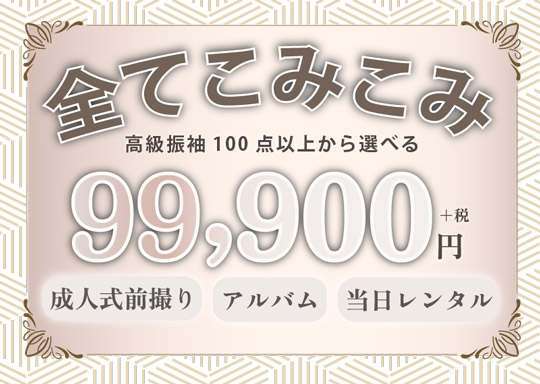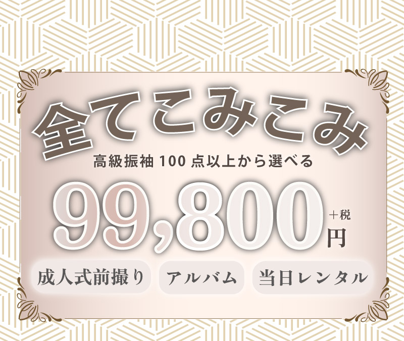 100種類の振袖から選べます。いずれも高品質な振袖ですので、ご安心ください。