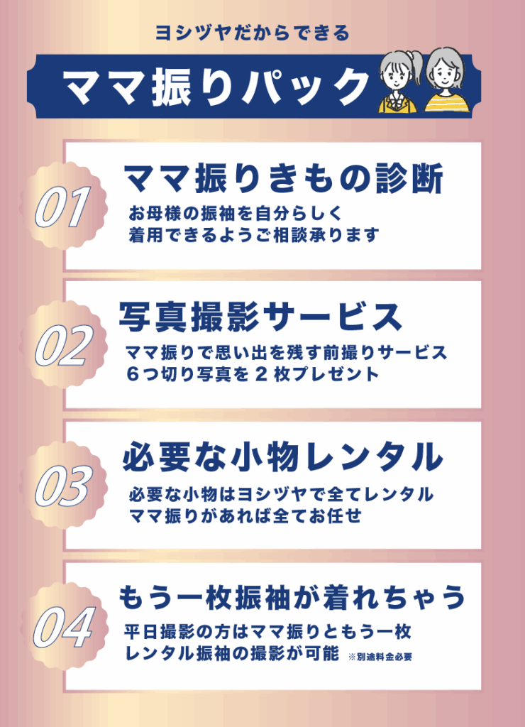 はい。振袖・小物をご持参頂ければ着付けや小物合わせが可能です。期間限定「ママ振り相談会」を行っております。その際は事前に下記よりご予約を頂いております。